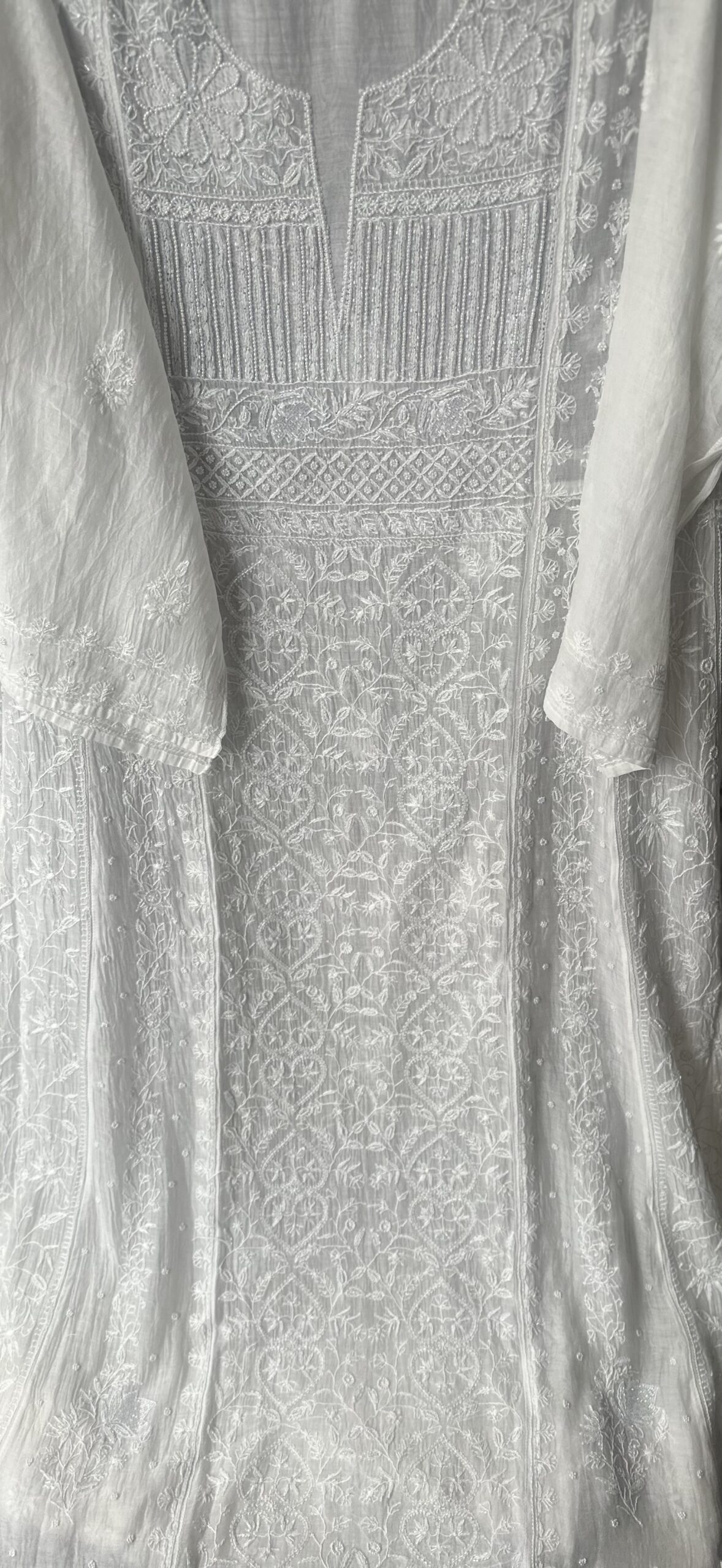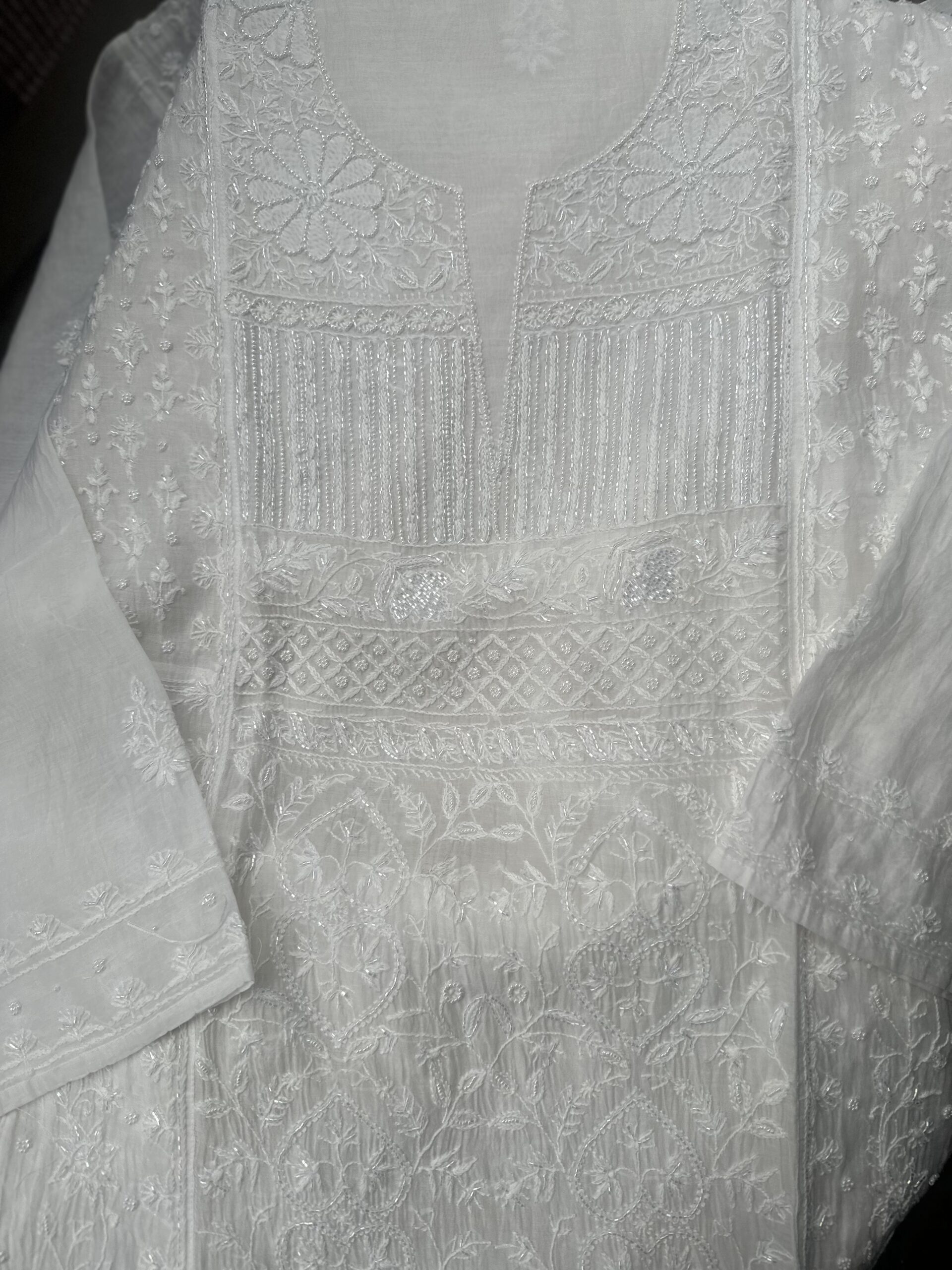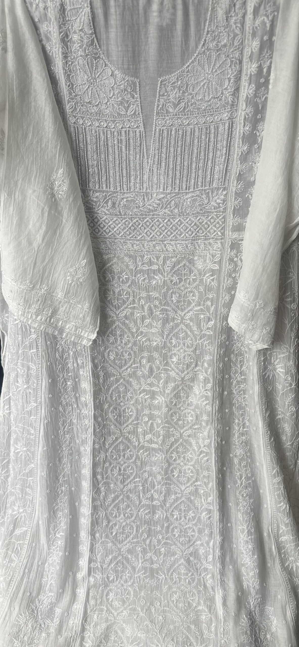 Mul Chanderi Anarkali and dupatta set with Fine Lucknowi Chikankari Beads And Pearls work