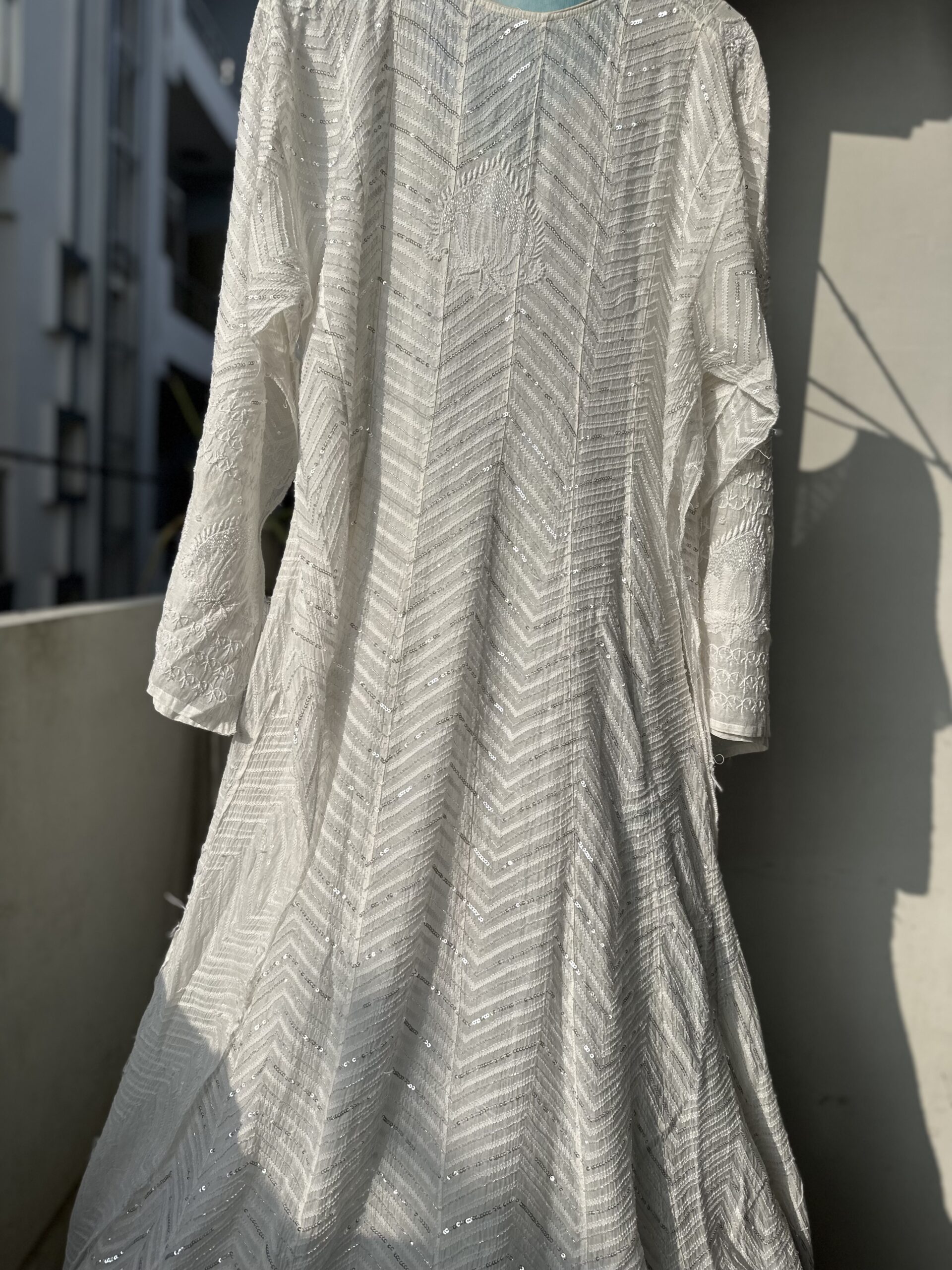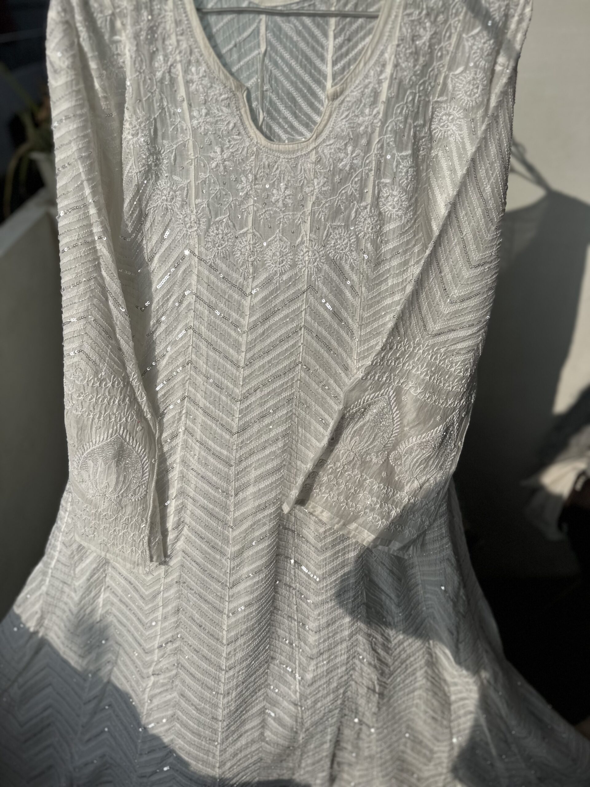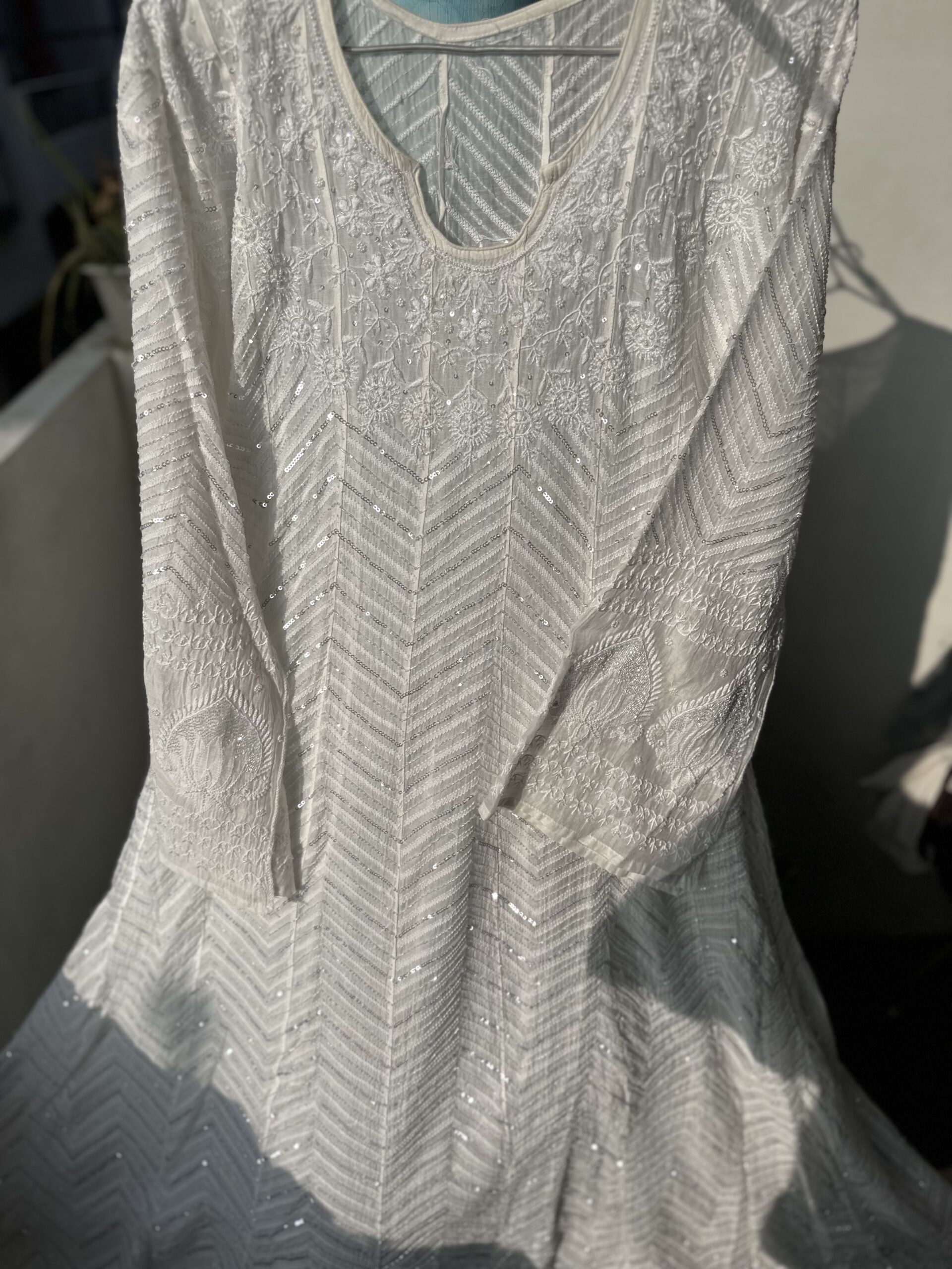 Mul Chanderi Front And Back Anarkali and dupatta set with Fine Lucknowi Chikankari Beads And Pearls work