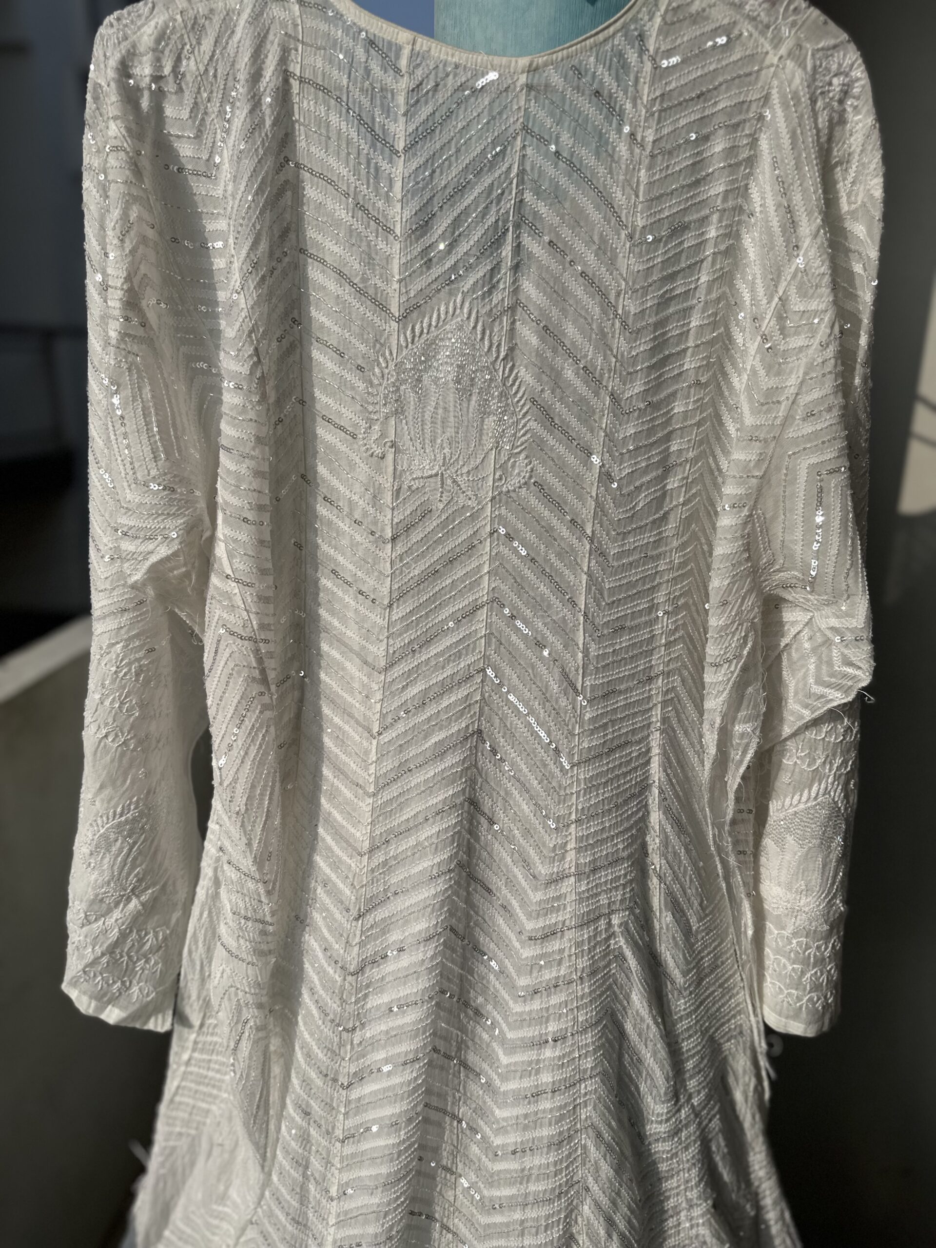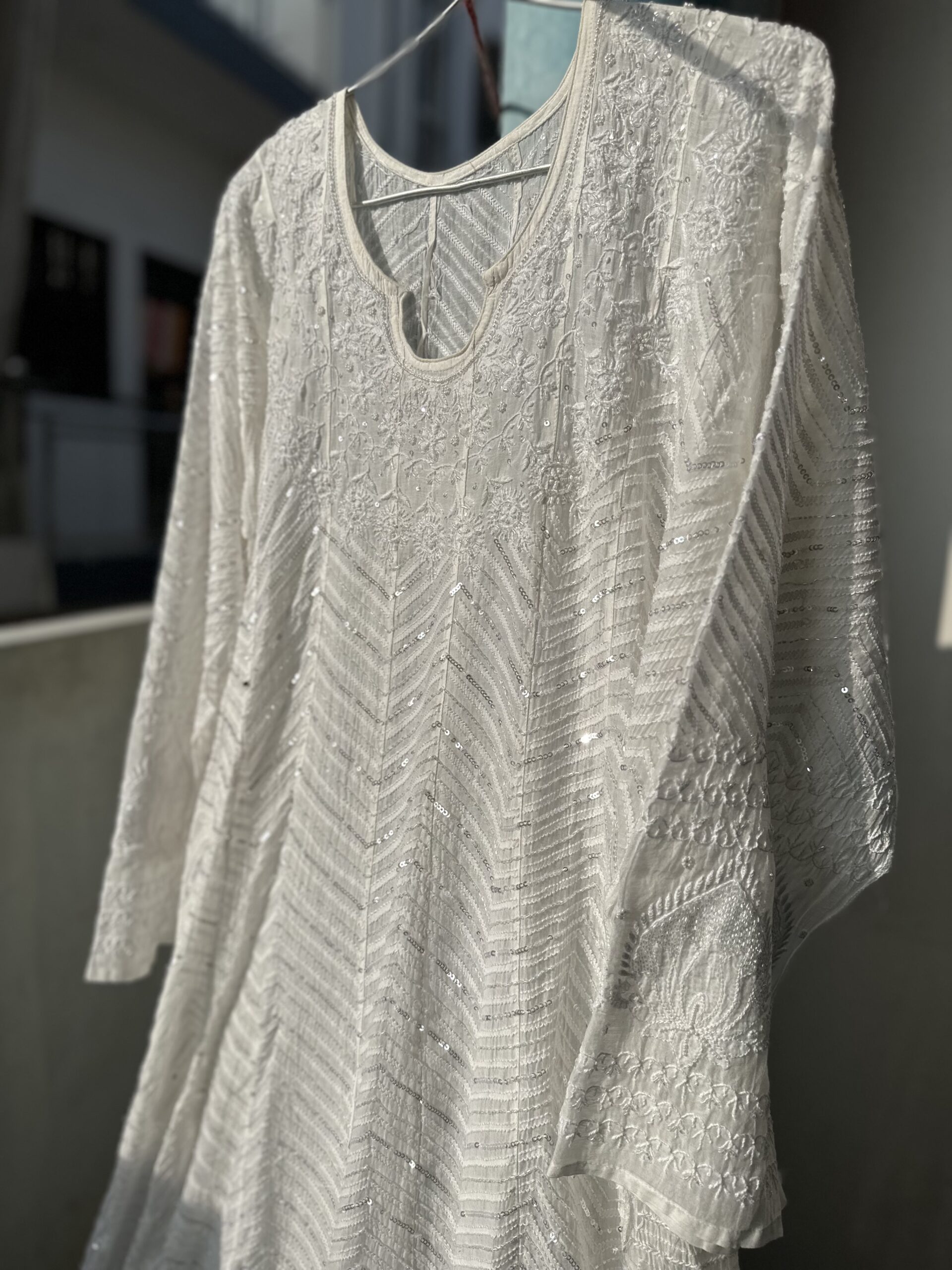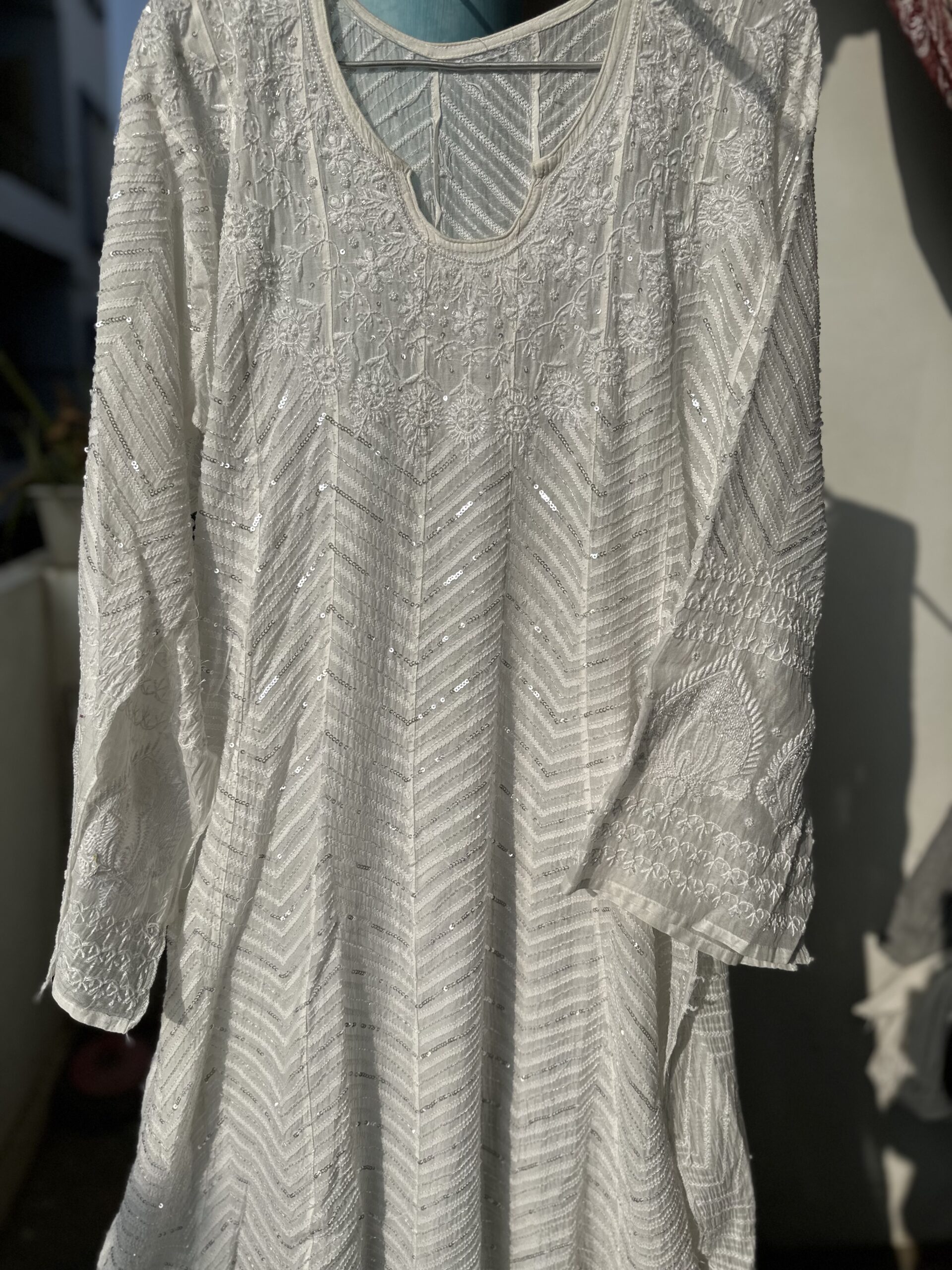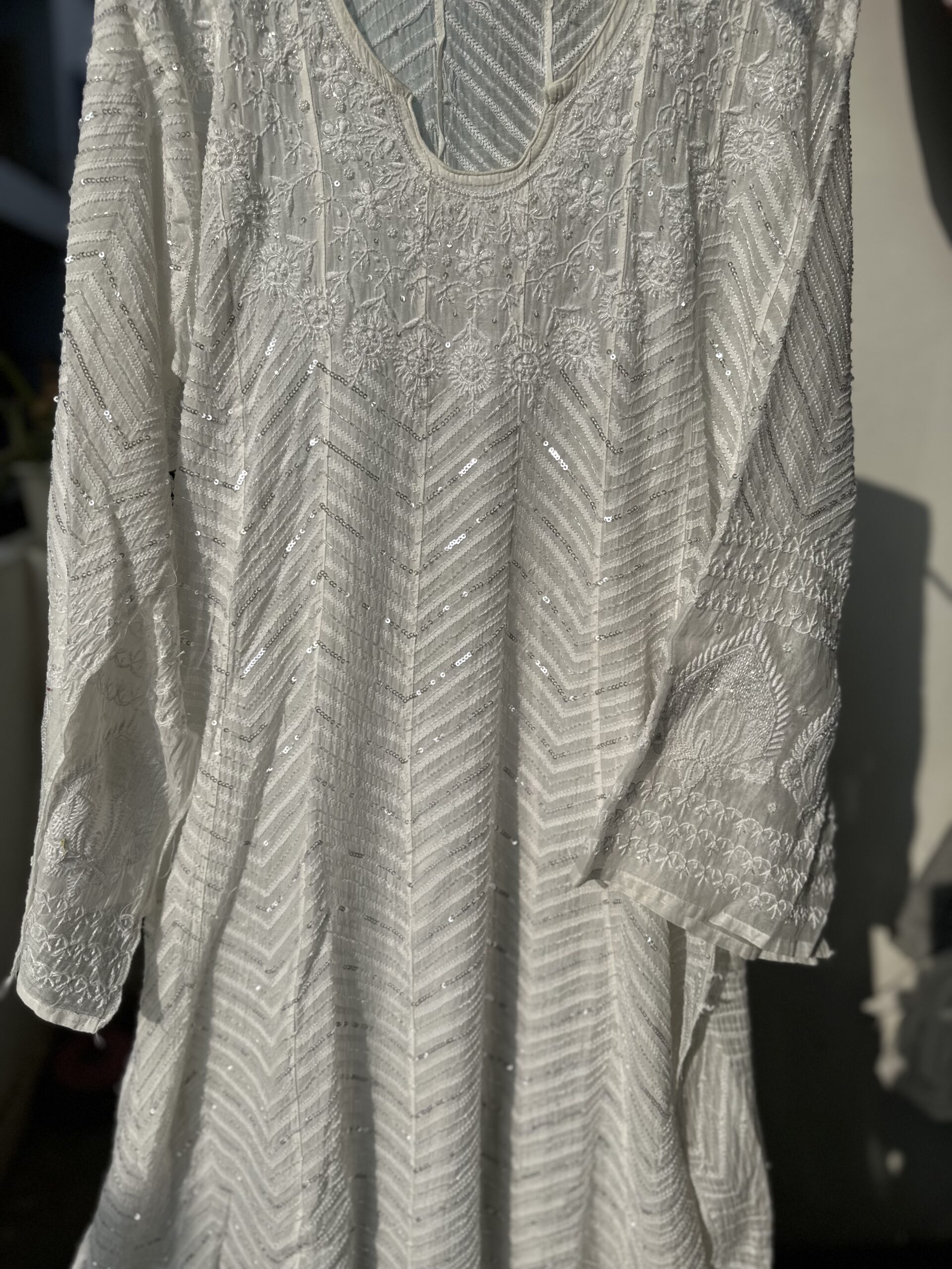 Mul Chanderi Front And Back Anarkali and dupatta set with Fine Lucknowi Chikankari Beads And Pearls work