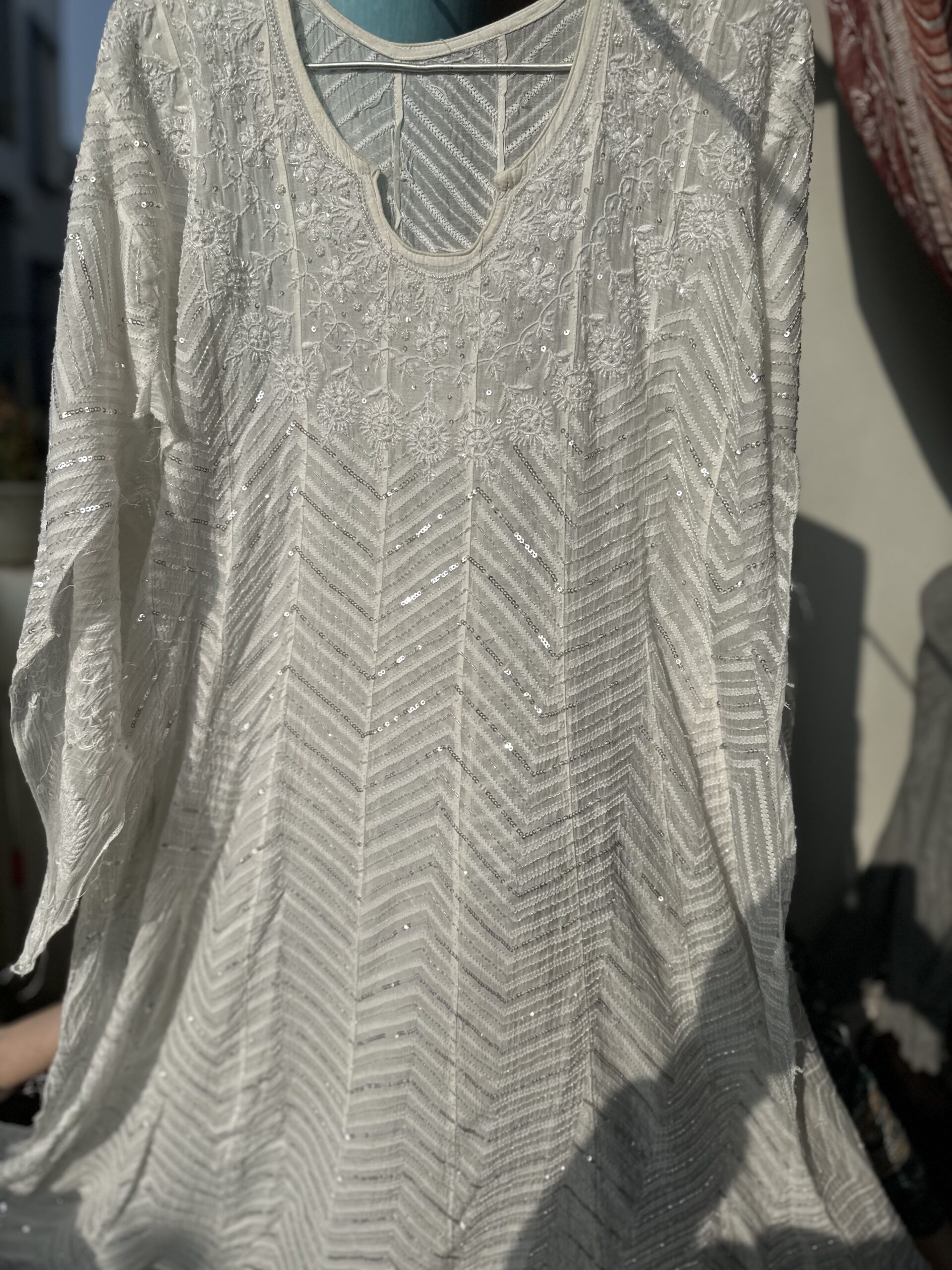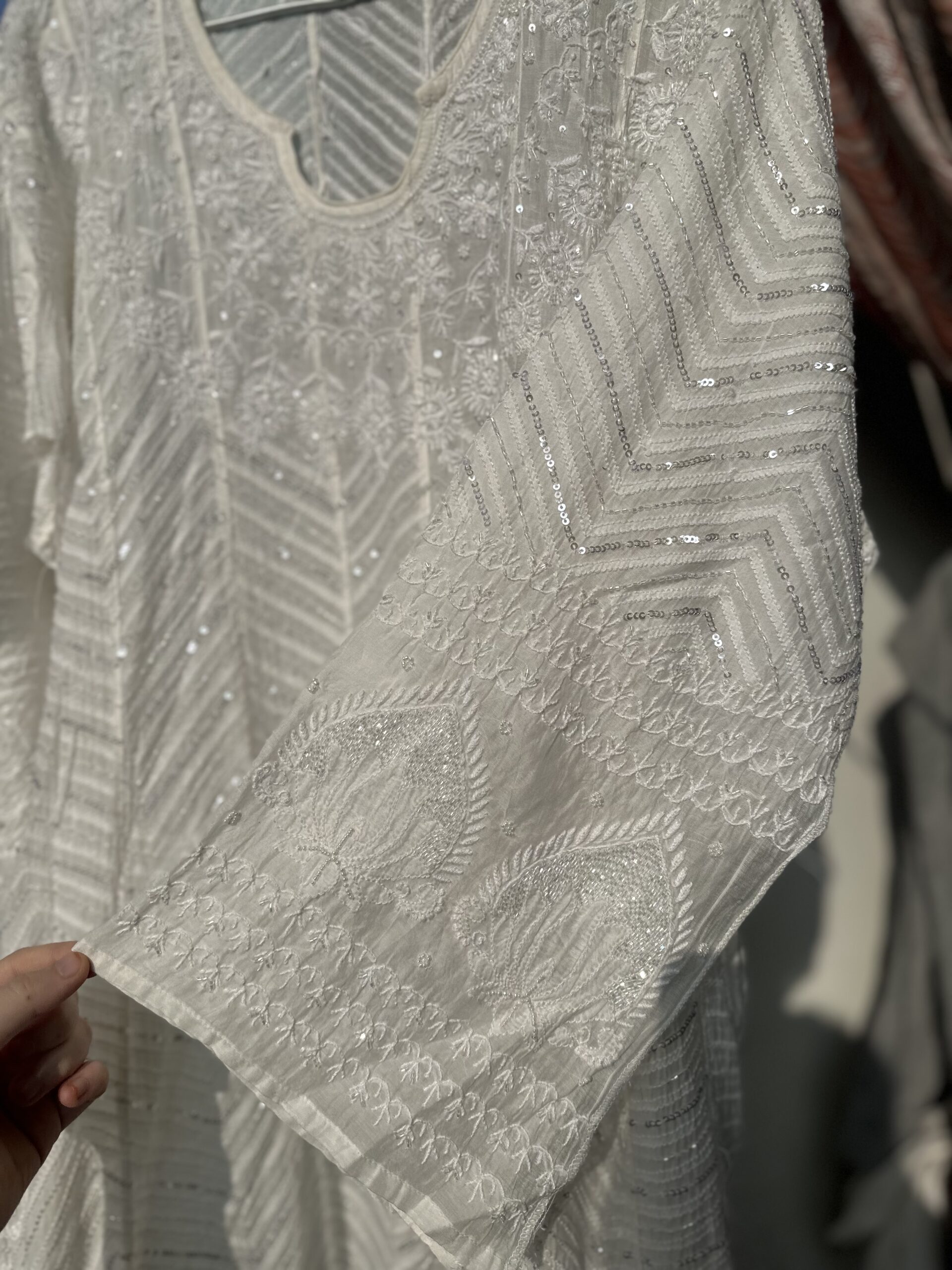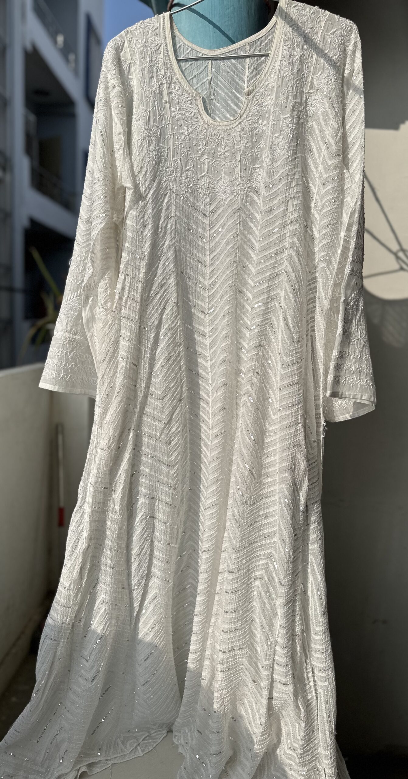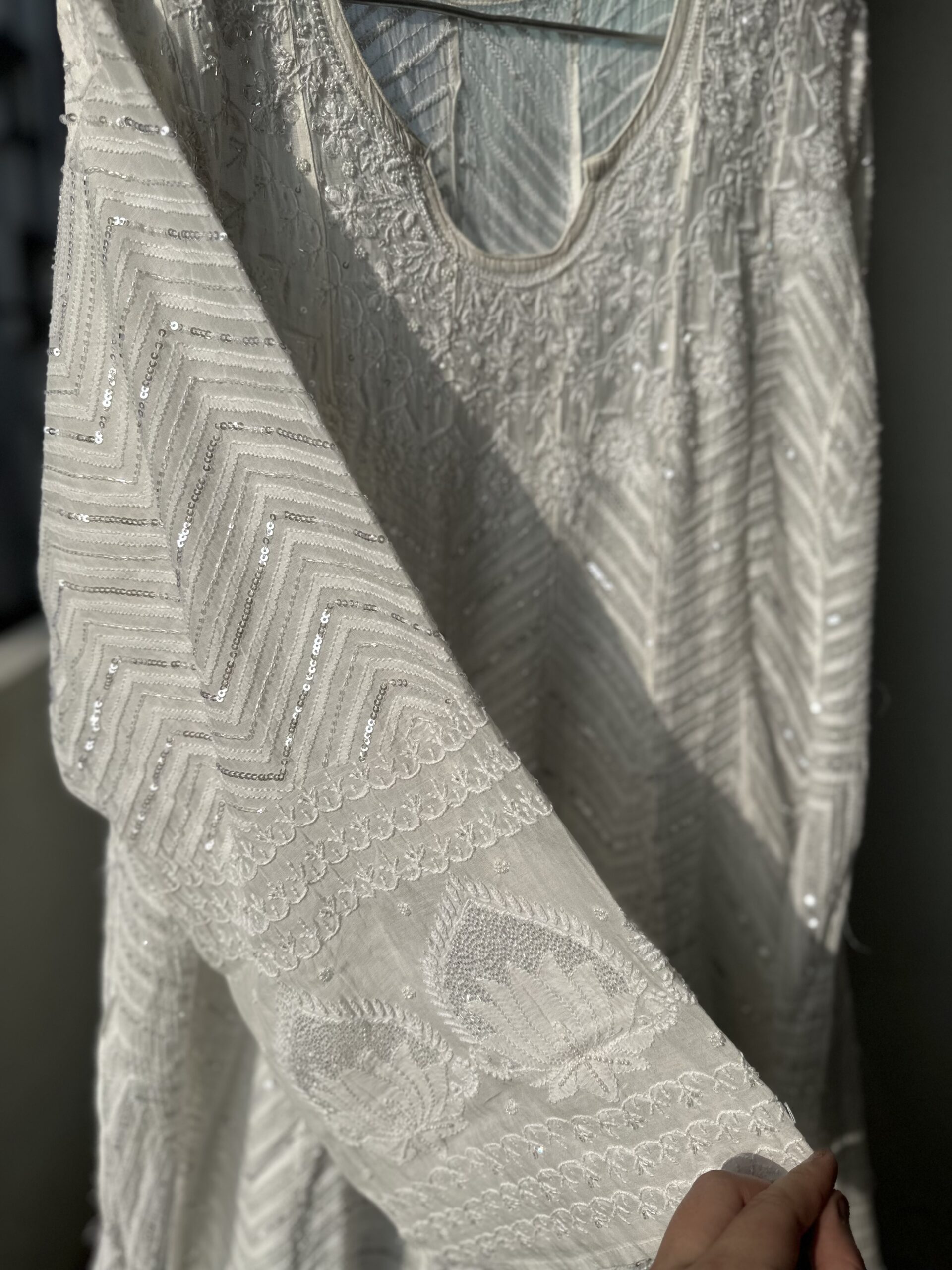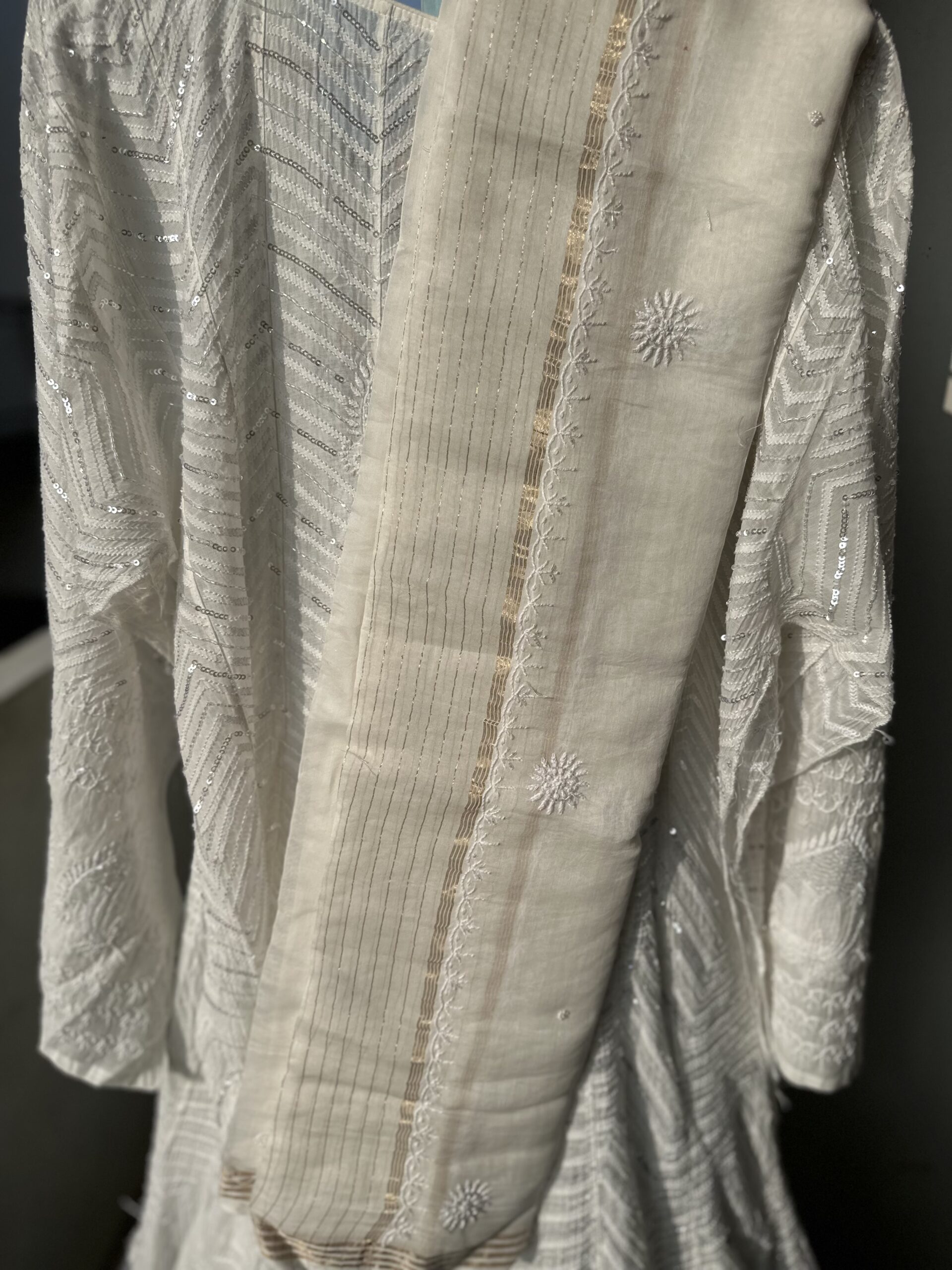 Mul Chanderi  Front and Back Anarkali and dupatta set with Fine Lucknowi Chikankari Beads And Pearls work