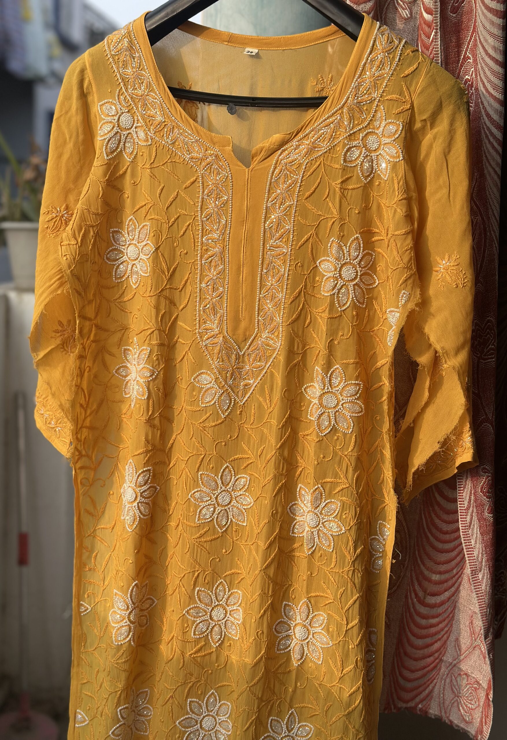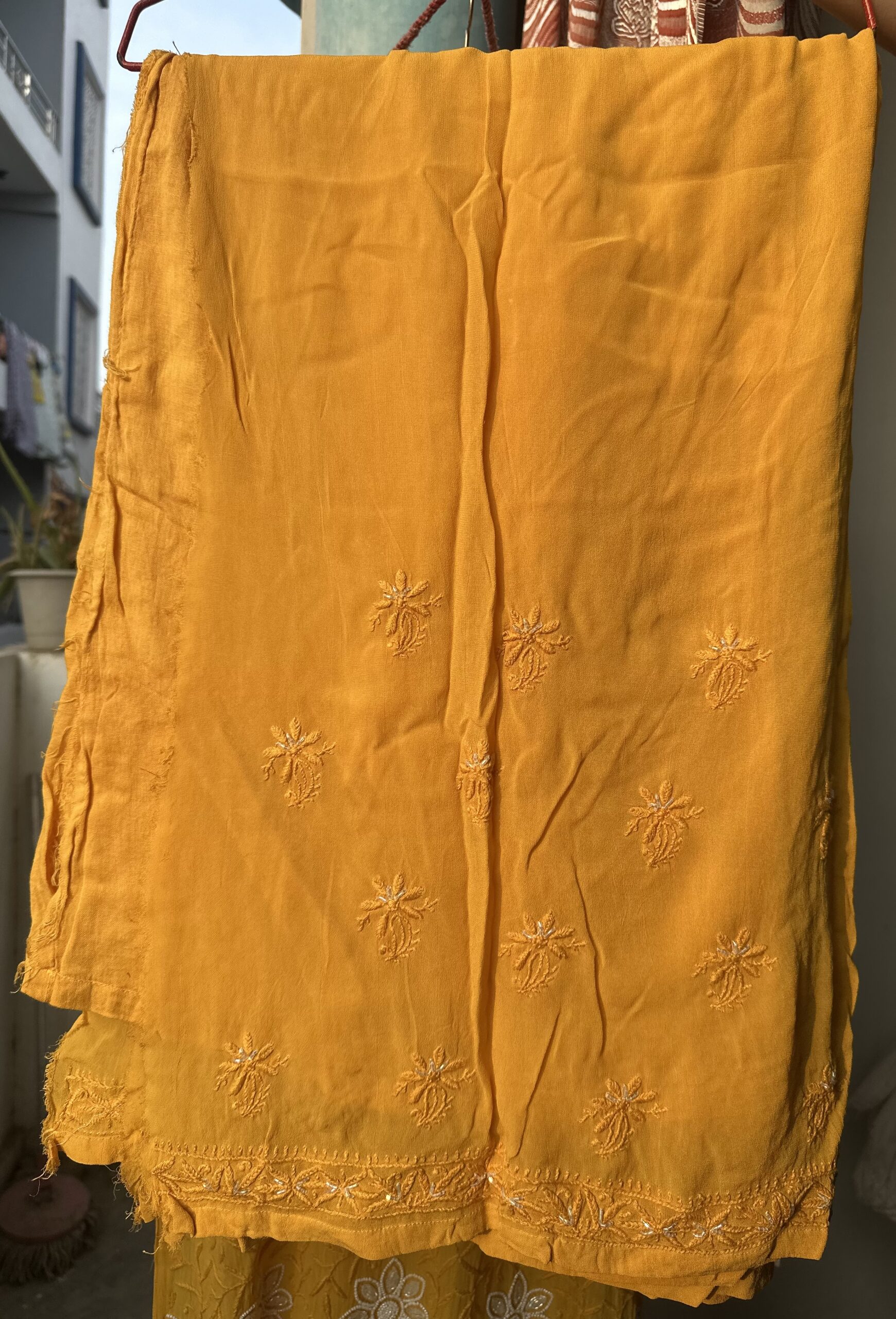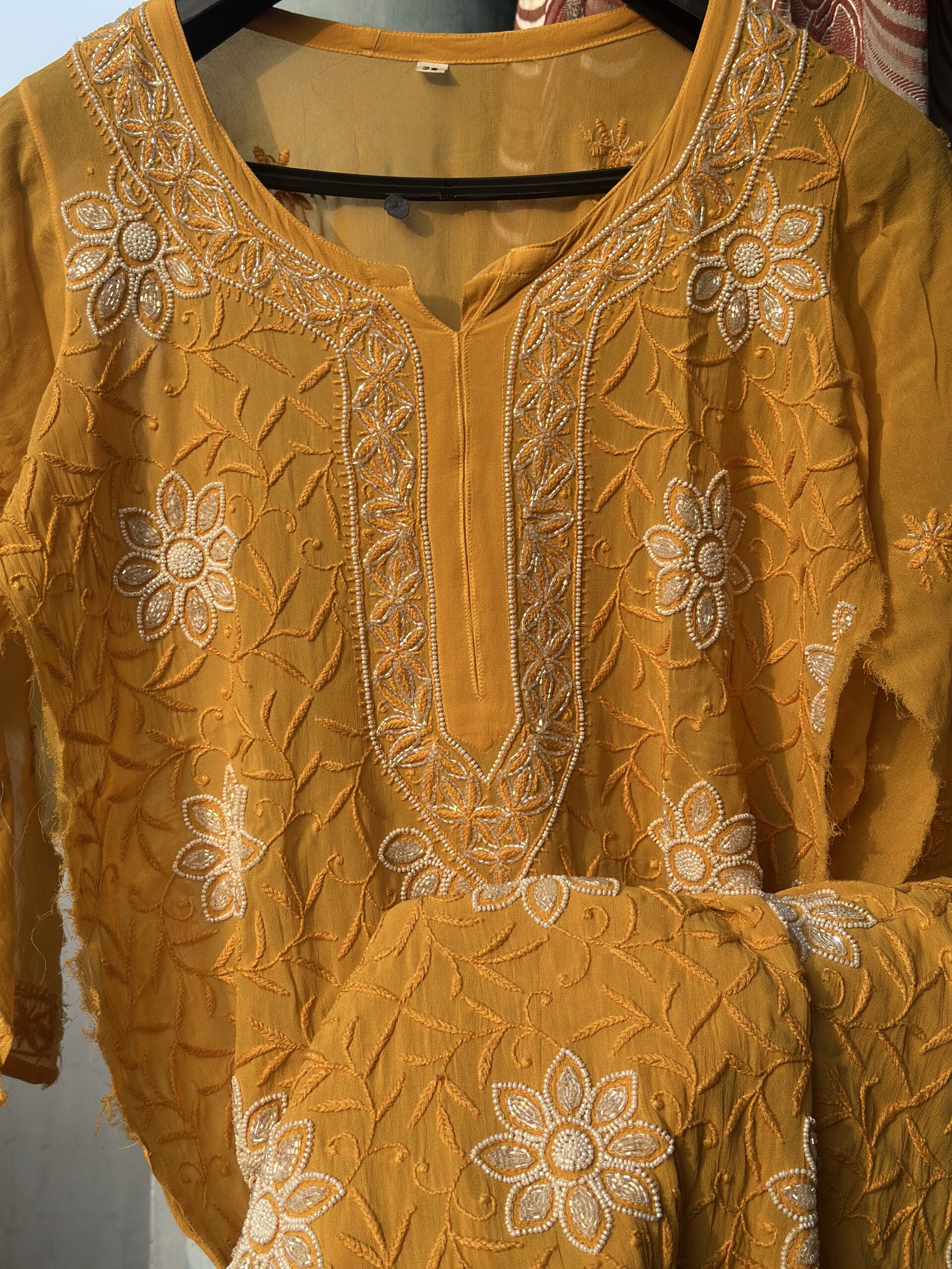 Mustard Viscose Georgette Chikankari Plazzo Set With Beads And Pearls Work